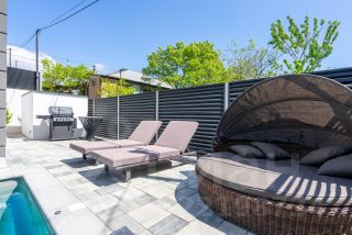 На территории выполнен ландшафтный дизайн, зона отдыха у бассейна с лежаками, плетенной круглой кроватью, иной мебелью, зона барбекю.