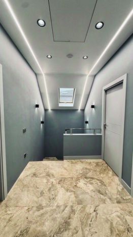Лаконичный минимализм в светлой гамме — оптимальный вариант для двухэтажного загородного дома со вторым светом и современной архитектурой. В помещениях царит атмосфера комфорта, но без выраженного загородного колорита. А вариативный свет подчеркивает интересную планировку и отделку коттеджа.