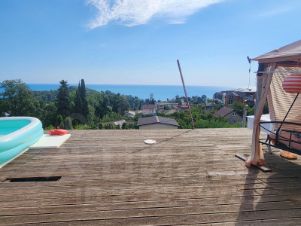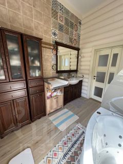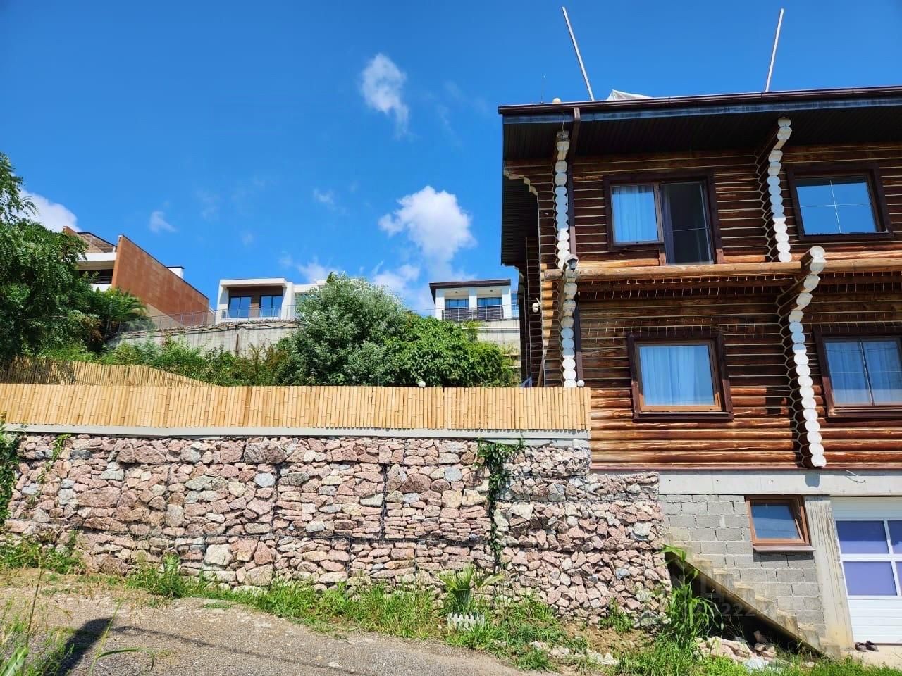 Дом из оцилиндрованного бревна , 330м2,жилая 280м2. 6 спален, большая гостиная со вторым светом совмещенная с кухней. 2 сан узла, кладовка (постирочная), гардеробная, на третьем этаже библиотека и выход на террасу 80 м2. С видом на море, большой цоколь с парковочным местом. Все инженерные системы в цоколе. Участок 5.5 соток, все коммуникации в доме: газ, вода, септик ЛОС,