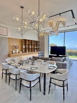 Панорамные окна с видом на море и зелёные холмы