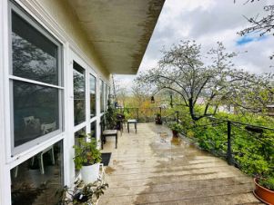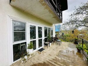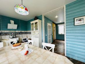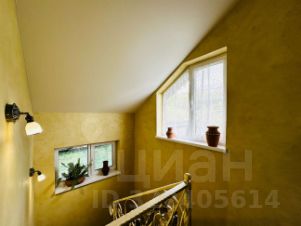 На первом этаже: Большая кухня-гостиная с витражным остеклением и выходом на террасу, совмещенный санузел, спальня.
