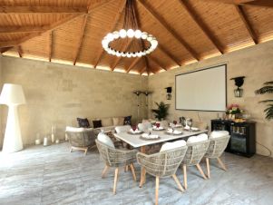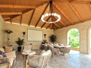 Дополнительные удобства: Большая беседка с кинотеатром и зоной отдыха с подогреваемым полом, парковка на 3-5 автомобиля, асфальтированная дорога до участка.