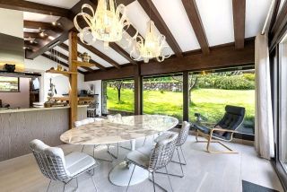 Из панорамных окон открывается захватывающий дух вид на величественные вершины гор, укутанные в снежные шапки зимой и расцветающие буйством красок летом. Классический стиль шале с его массивными деревянными балками, каменной кладкой и уютным камином идеально вписывается в окружающий ландшафт.