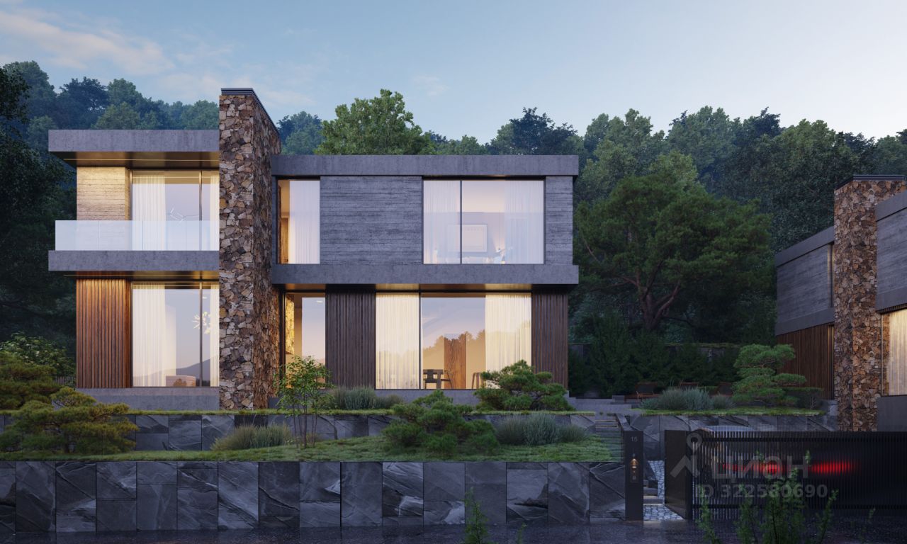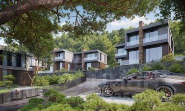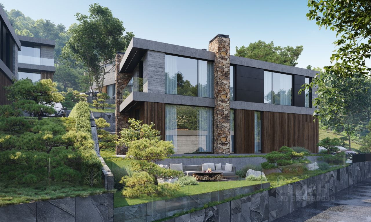 Коттеджи расположены вдоль склона и соединены шестиметровой дорогой, организованной по принципу серпантина, гармонично интегрированной в окружающую местность. Ярусное расположение участков позволяет сохранить видовые характеристики для каждого дома.