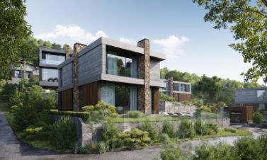 - Премиальные материалы отделки фасада (термоясень, испанский микроцемент, бежевый сланец брекчия)