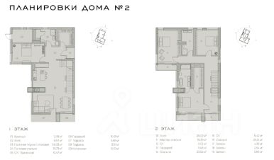Планировка: 1 этаж - кухня-гостиная, гостевая спальня, гардеробная, санузел, постирочная; 2 этаж: мастер-спальня с санузлом и гардеробной, две спальни, санузел.