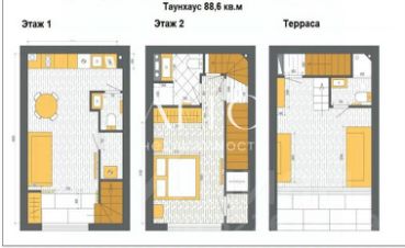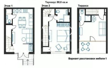 Двухэтажный таунхаус 88,6 кв.м. c просторной террасой на третьем этаже (террасу возможно переделать в дополнительную комнату) продается без отделки. Расположен в центре эко-курорта и имеет красивый вид на территорию комплекса.