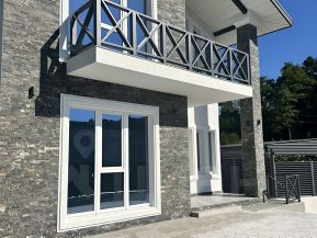 Дом выполнен в стильном шале: фасад отделан ценизитом с силиконовой текстурой, что эффективно защищает его от влаги, а элементы декора из природного камня придают особый шарм и респектабельность. Территория вокруг выложена брусчаткой и керамогранитной плиткой.