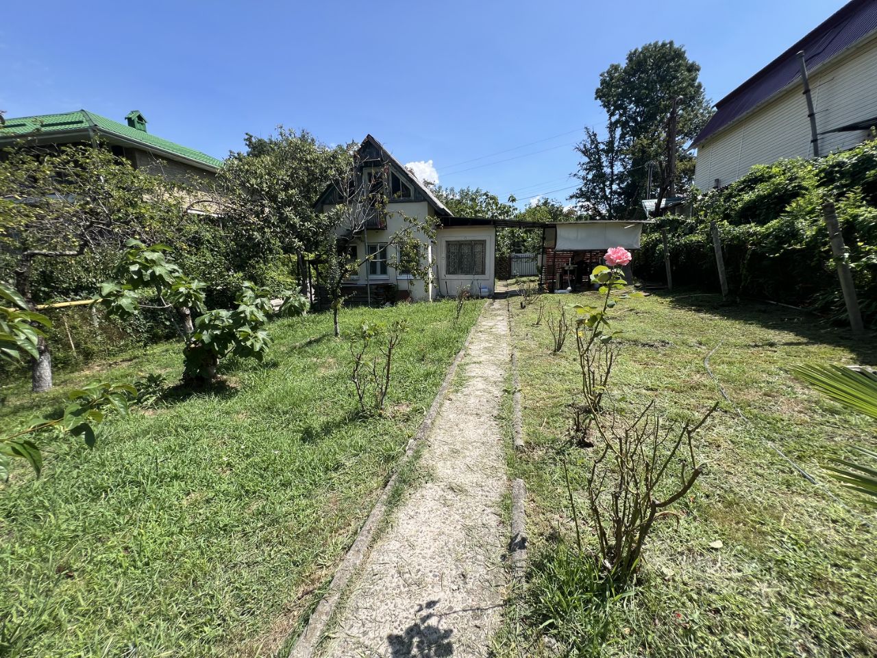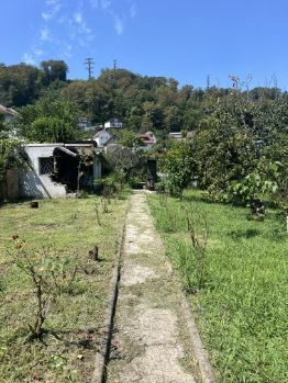 Участок плодородный: растут 2 дерева хурмы, мушмула, 3 дерева вкуснейшего инжира, 3 дерева фейхоа, яблони, шикарная слива. Розы по всему двору, 2 пальмы.