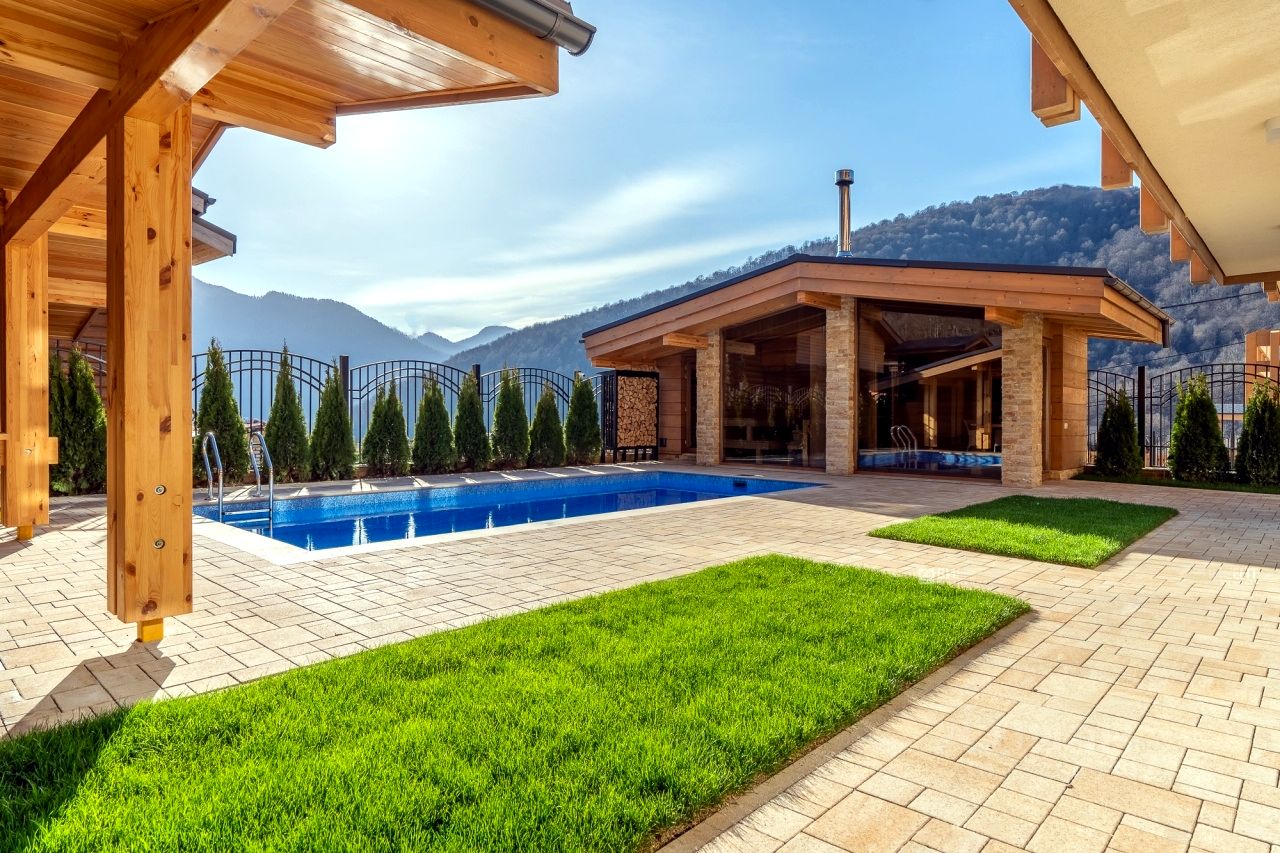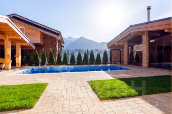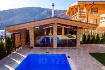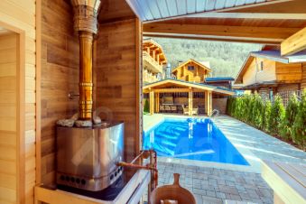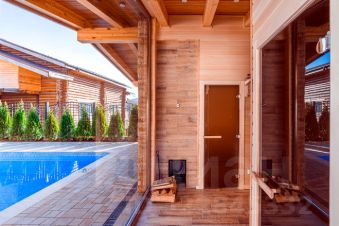 На прекрасном участке, площадью 9 соток земли, расположились бассейн, так же баня и зона для барбекю.