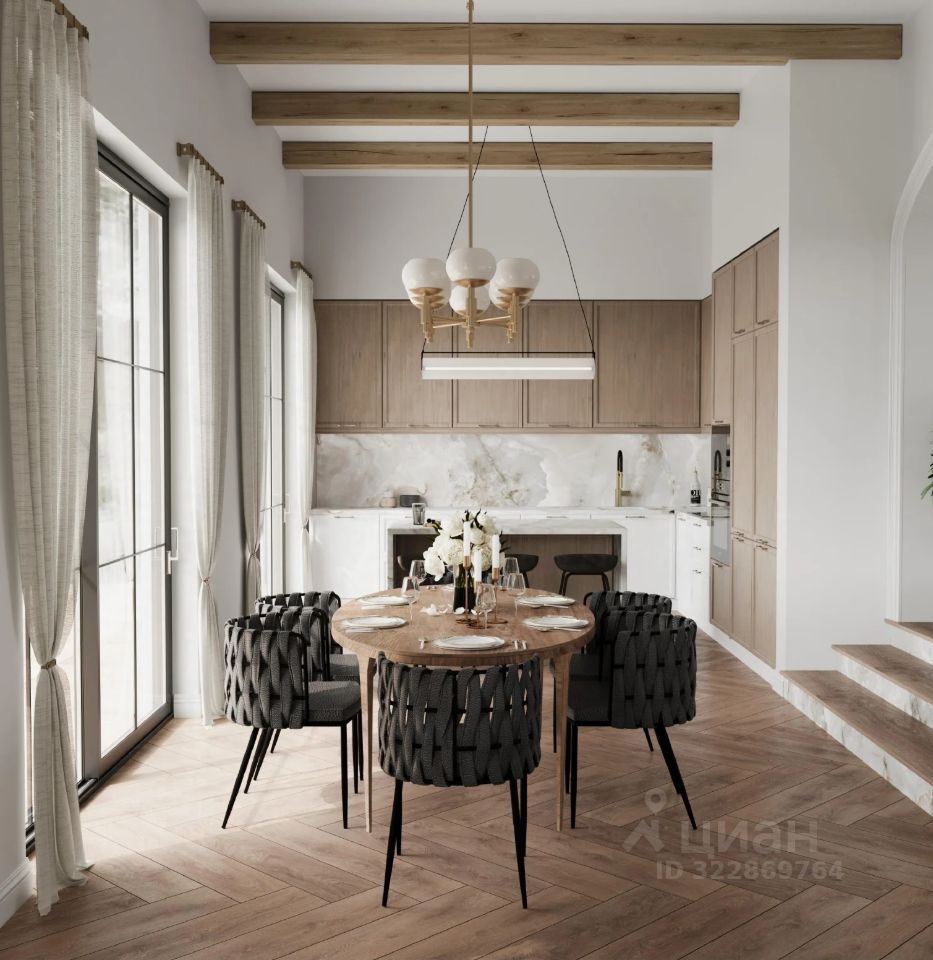 - Кухня-гостиная с полукруглыми панорамными окнами