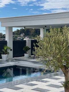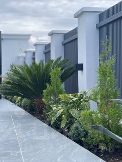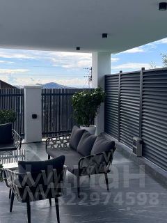 По периметру участка выполнено ландшафтное озеленение благородными вечнозелеными культурами, в т.ч. Оливковое дерево, Пальмы, Туи, Папоротник и т.д.