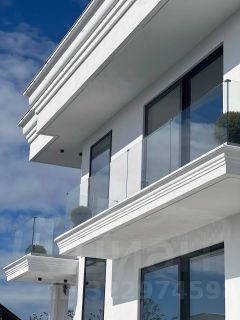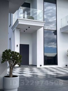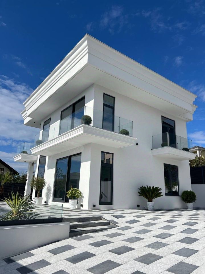 Дом 300 кв.м. выполнен в архитектурном стиле "Райт", построен и облицован дорогими и благонадежными материалами, которые защищают дом от влаги и держат благородный белый цвет сквозь года.