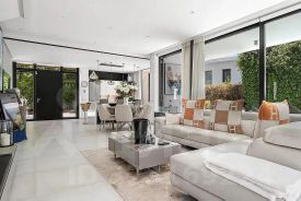 Просторная гостиная с панорамными окнами и выходом на террасу