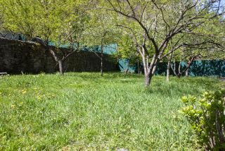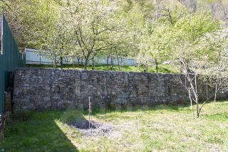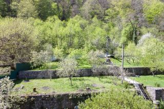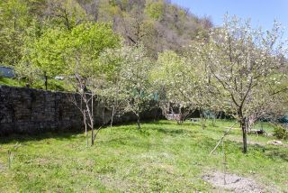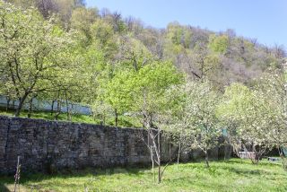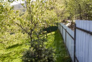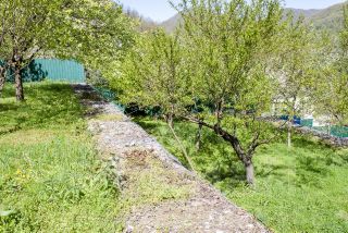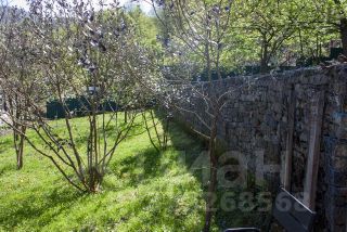 К участку ведёт бетонная дорога, территория огорожена и укреплена габионами, на участке растут плодовые деревья.