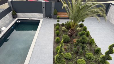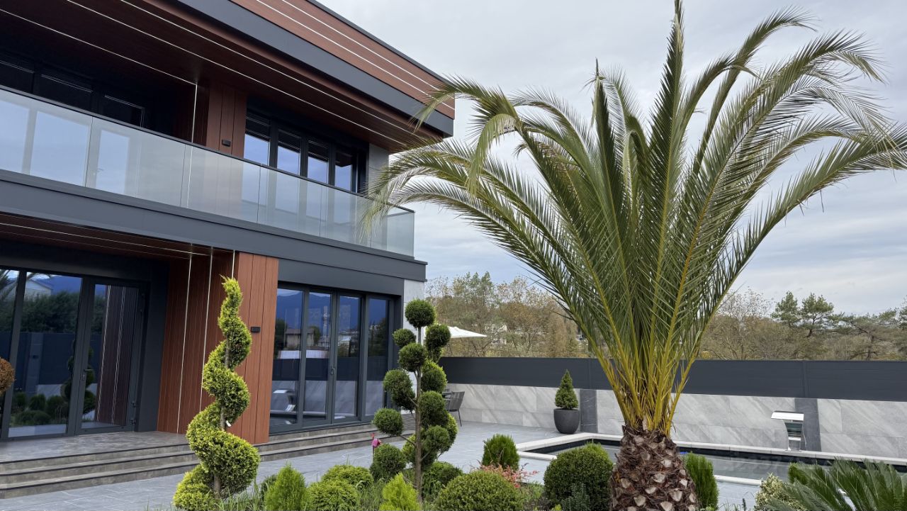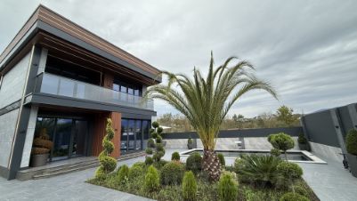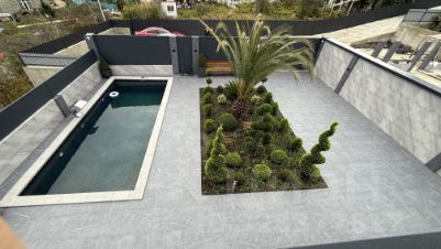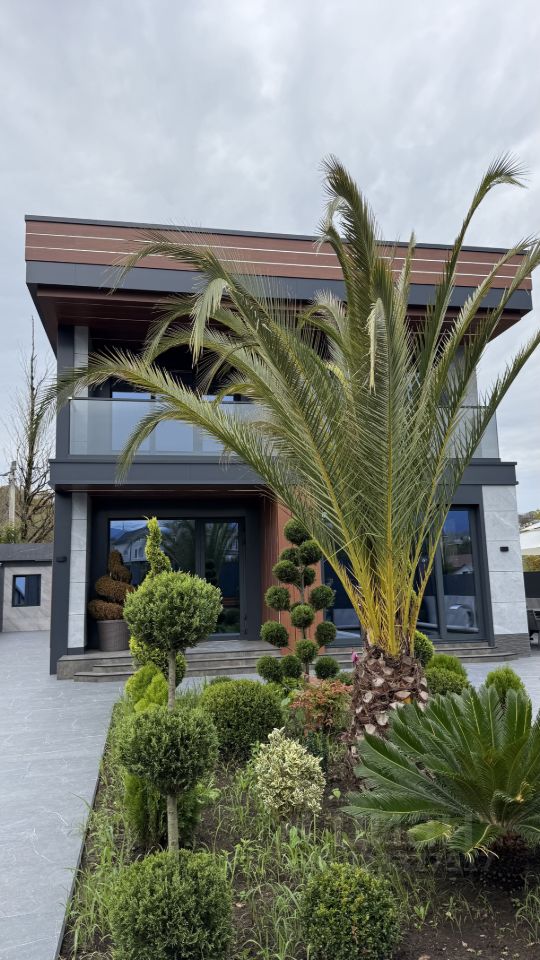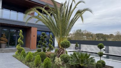 Ландшафтное озеленение- высажены экзотические растения, керамогранит по всей территории, круглогодичный подогреваемый бассейн с фонтаном.