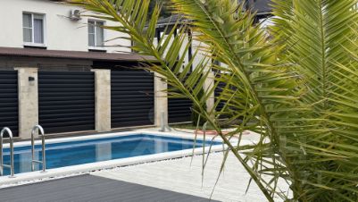 Автоматические ворота, гараж на 2 места плюс гостевая парковка.