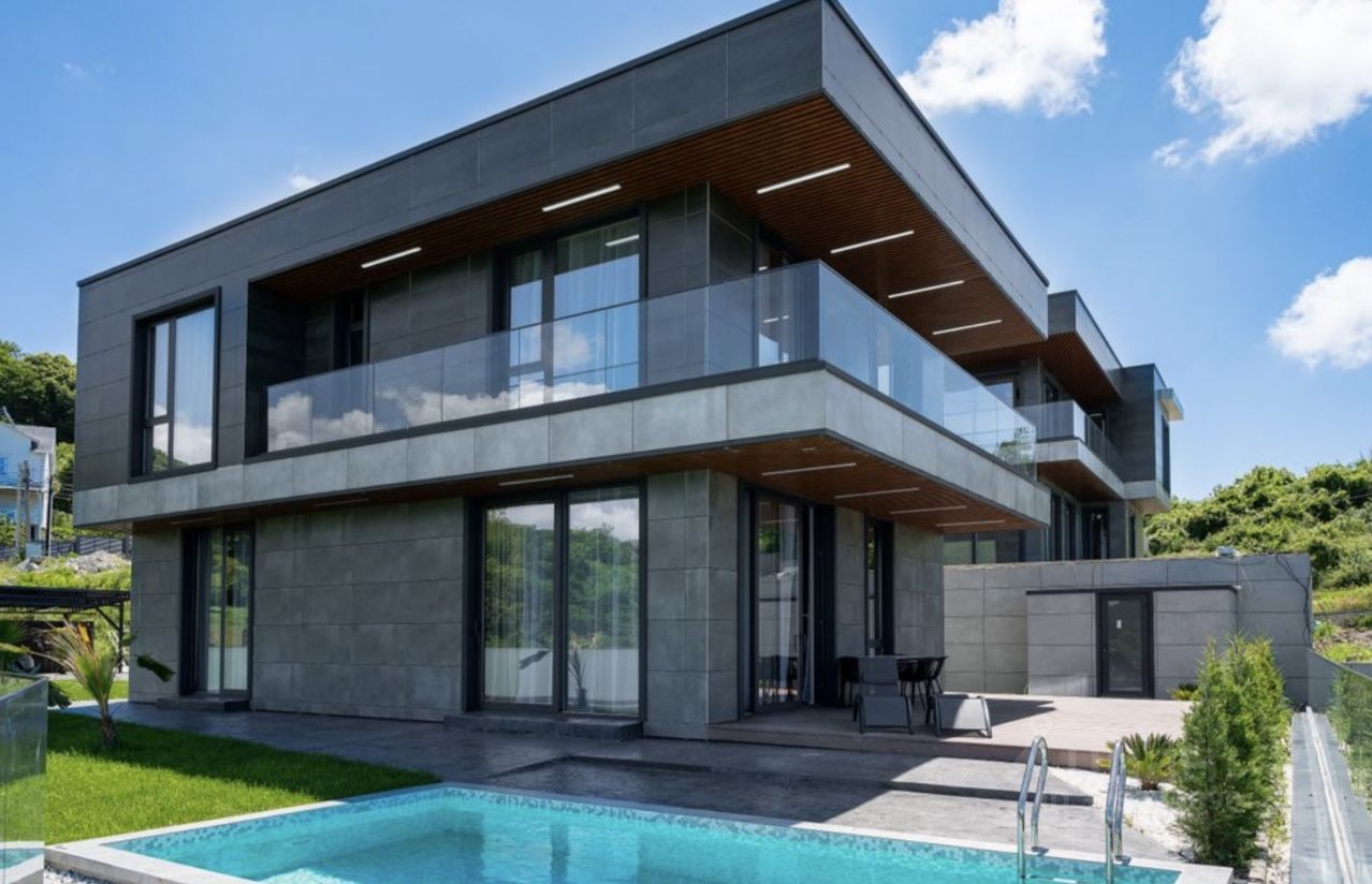 Коттедж площадью 287кв.м., построен с огромным запасом прочности - ЦЕЛЬНОМОНОЛИТНАЯ конструкция на свайном поле, алюминиевые окна с раздвижками, мультифункциональные стекла, вентилируемый фасад из керамогранита, высота потолков 3.7 метров