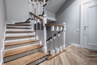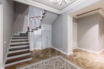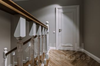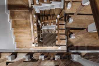 Изюминка дома уникальная винтовая лестница. Элементы перил изготавливали на заказ. Ступеньки сделаны из массива дерева.