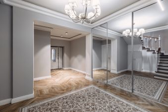 При входе в дом попадаем в прекрасный холл с собственной вместительной кладовой и зеркальным шкафом-купе.