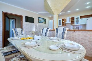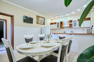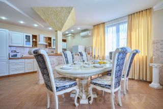 На первом этаже вас ждет большая кухня с массивным обеденным столом и элегантной барной стойкой — идеальное место для кулинарных шедевров и душевных бесед. Семейный номер с двумя спальнями подарит уединение и покой, а просторный гостиный зал с выходом во двор станет центром веселых праздников и теплых встреч.