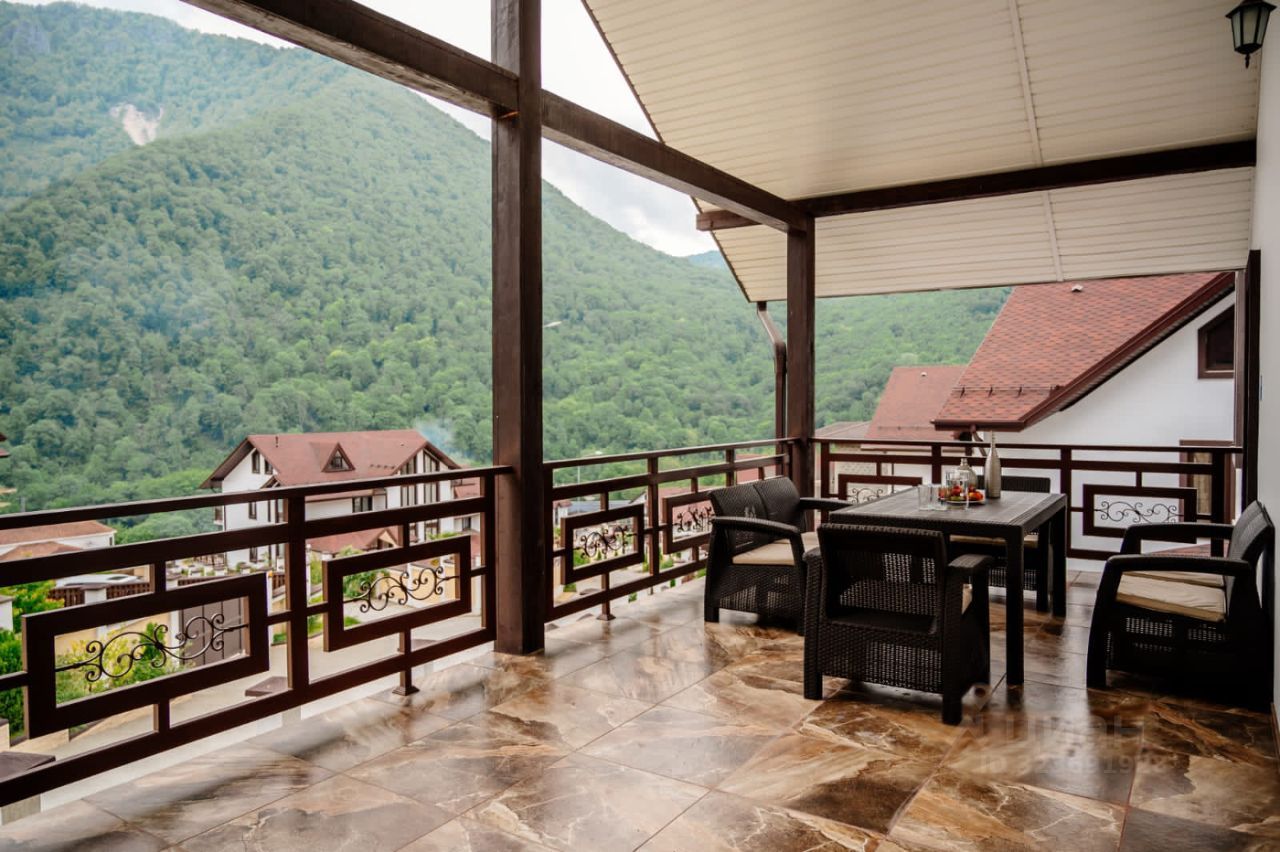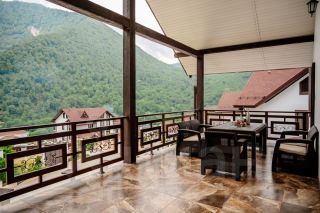 Первый этаж встречает второй гостиной с мягким диваном и большим телевизором, мини-кухней и просторной спальней с санузлом. Выход на большую террасу под навесом с мебелью из натурального ротанга станет вашим любимым местом для встреч с видом на гору Аибгу и Ущелье Ах-Цу.