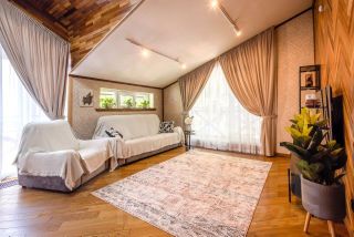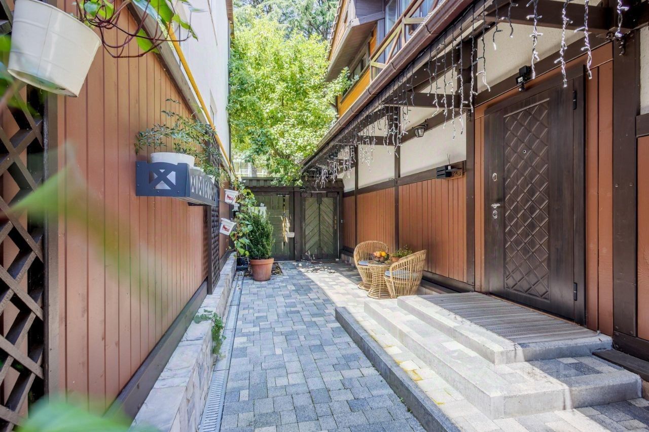 На территории дома обустроено место для хранения спортивного инвентаря — лыж, сноубордов и велосипедов. Уютное приватное патио с мангальной зоной и уличной мебелью станет любимым местом для вечерних посиделок с шашлыком под треск поленьев и звездным небом.