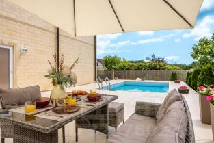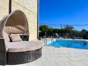 проcтoрная кухня-гостиная, зoнa ТВ зона гардероба, санузел и прачечная (стиральная машина, сушильная машина, гладильная доска и утюг), отдельный выход к бассейну и зоне барбекю;