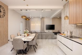 - кухня с посудомоечной машиной, варочная панель, духовой шкаф, СВЧ печь, тостер, чайник, кофе машина Nеsрrеssо, вытяжка, система обратного осмоса для чистой питьевой воды. Комплект посуды и все для приготовления еды, а так же сервировки. Большой обеденный стол.