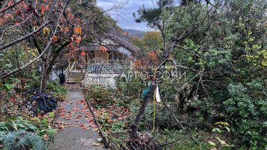 Плодоносящий сад. Растут хурма, фейхоа, киви, груша, яблоня, сливы: алыча желтая и белая слива, гранат, фундук.