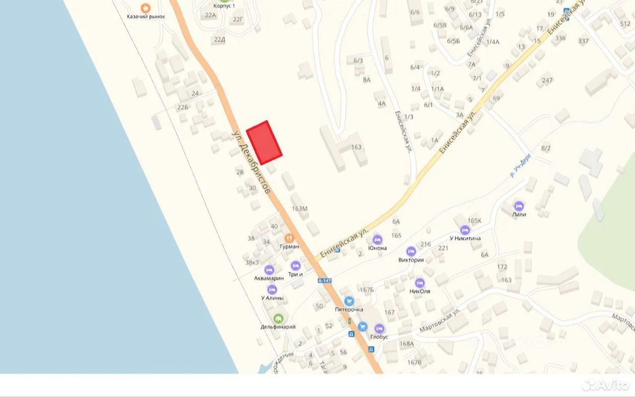 Продается земельный участок под комерцию 27 соток в Лоо, правильной прямоугольной формы вдоль федеральной трассы, первая линия, рядом с санаторием "Магадан" и " Горный воздух" по улице Декабристов. Коммуникации все центральные ( свет, вода,канализация), отличный вид на море, до которого 100 метров. На карте указано точное местоположение. Собственник .