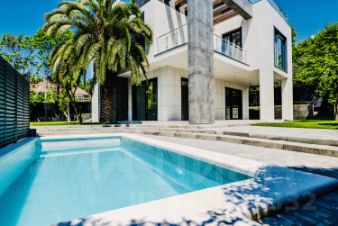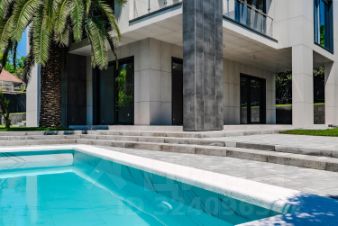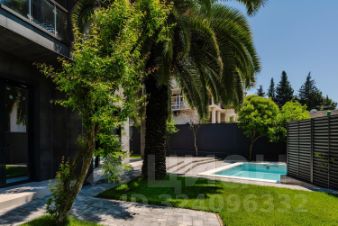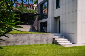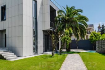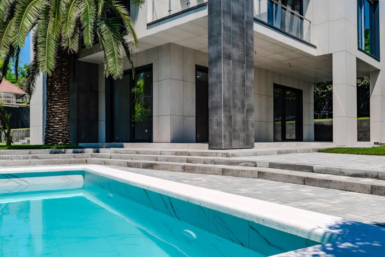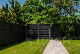 Ровный приватный участок с партерным ландшафтом, системы автополива, стильный подогреваемый бассейн с зоной отдыха, крытый паркинг для нескольких авто.