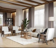 Планировка дома продуманная и функциональная, на первом этаже расположилась просторная гостиная, где можно отдохнуть у камина с семьей или гостями. Предусмотрено 4 спальни и 2 ванные комнаты, вместительная гардеробная.