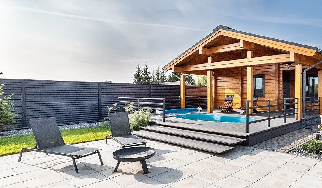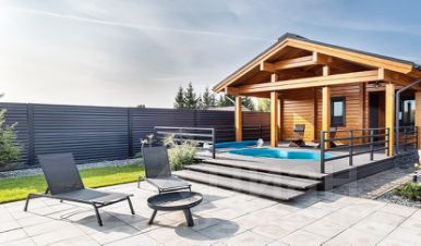 В состав усадьбы также входит зона релакса, а именно - банный комплекс, также выполненный из клеёного бруса, площадью 60 кв.м., с уютной беседкой и бассейном.