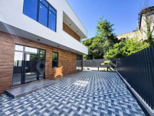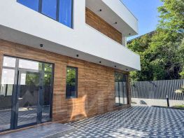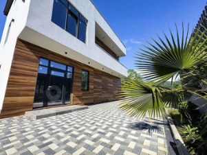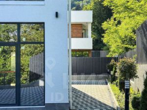 Фундамент домом выполнен на сваях. Отделка фасада комбинированная - керамогранит, декоративная штукатурка. Установлено освещение.