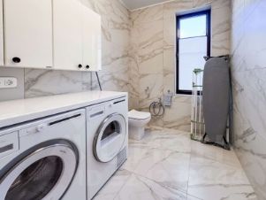 2 этаж - мастер-спальня с гардеробной, санузлом, ванной и выходом на балкон, мастер-спальня с санузлом, душевой и выходом на балкон, спальня с выходом на балкон, санузел с постирочной, где установлены стиральная и сушильная машины;