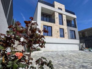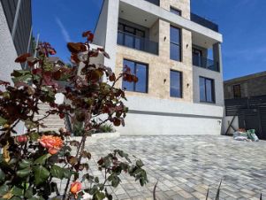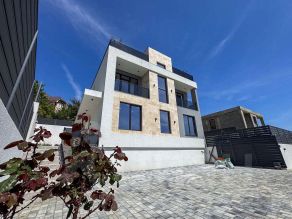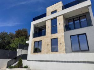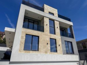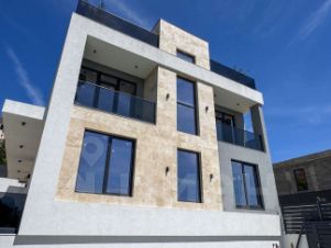 Архитектура современная, отделка фасада - натуральный камень травертин.