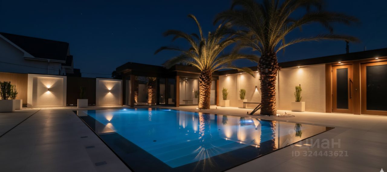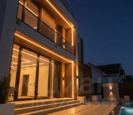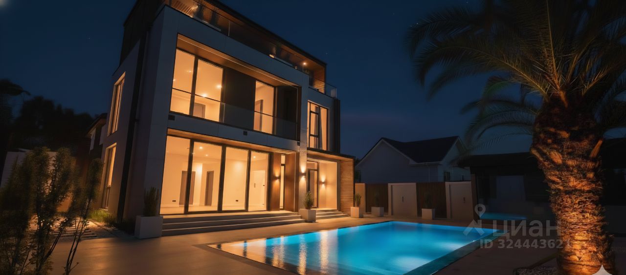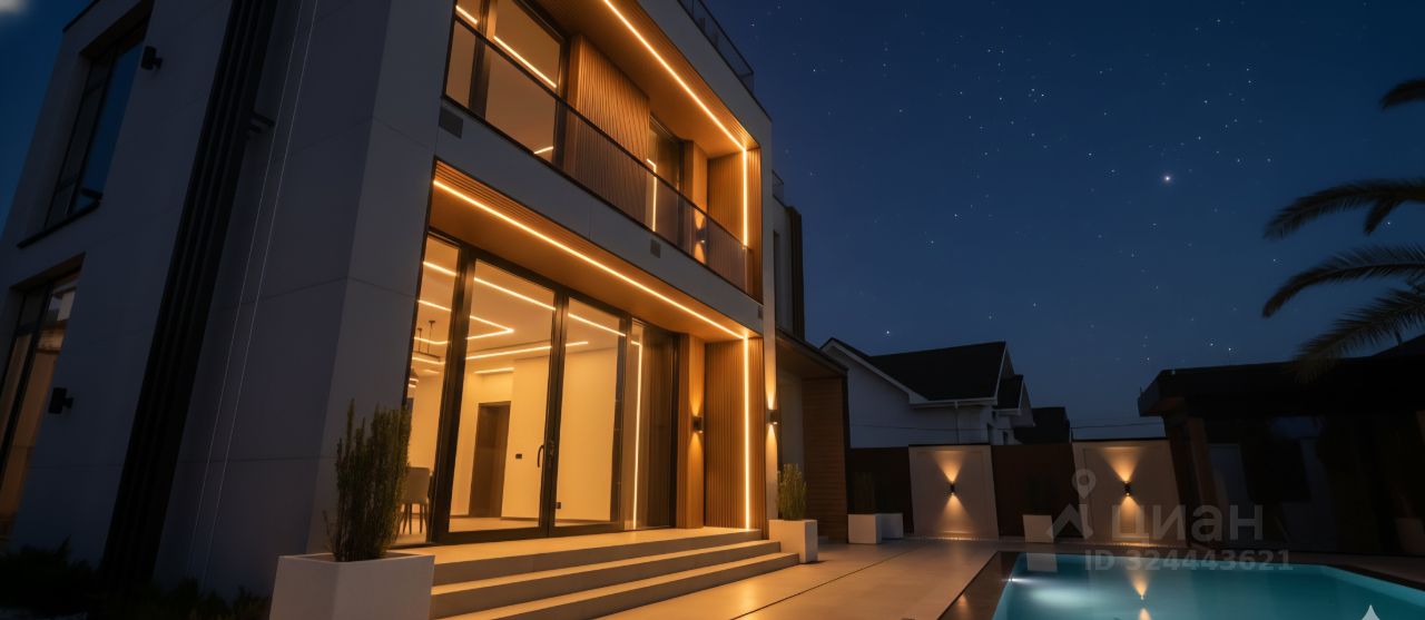 Современный дизайн фасада с использованием стильной подсветки по периметру и на фасаде, что делает его невероятно эффектным в вечернее время.