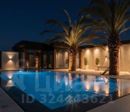 Ландшафтный дизайн включает пальмы, ухоженные кустарники и стильные элементы мощения.