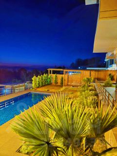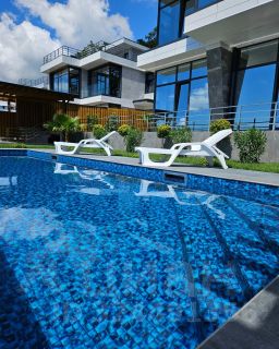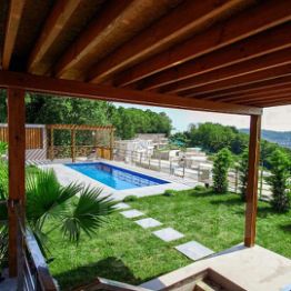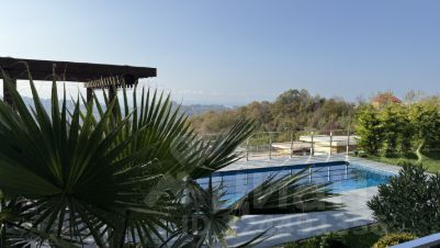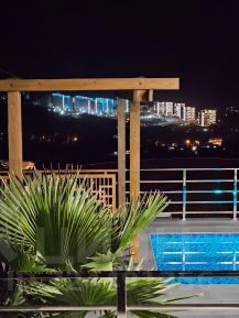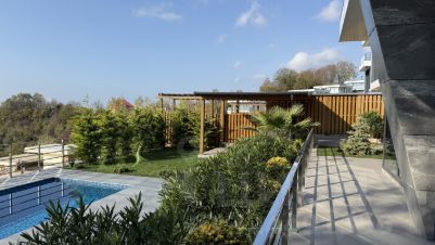 Территория двора огорожена, подогреваемый бассейн, ландшафтный дизайн, зона отдыха и барбекю с невероятными видами на море и горы.