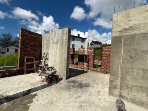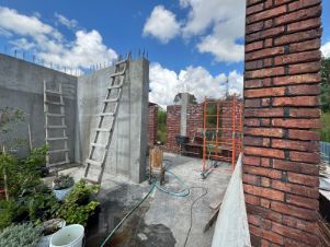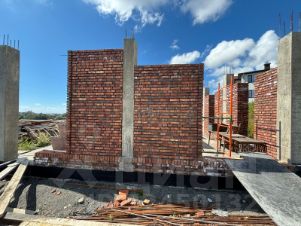 Есть разрешение на строительство на 240м2. Начали строку по проекту. Архитектурный стиль Лофт. Проект дарим новому собственнику. Заводили качественный кирпич, так как планировали дом для себя. Все стройматериалы выбирали высокого качества. Все делали строго по проекту, выдерживая технологии.