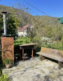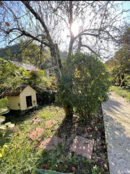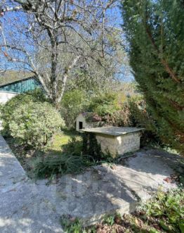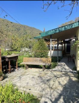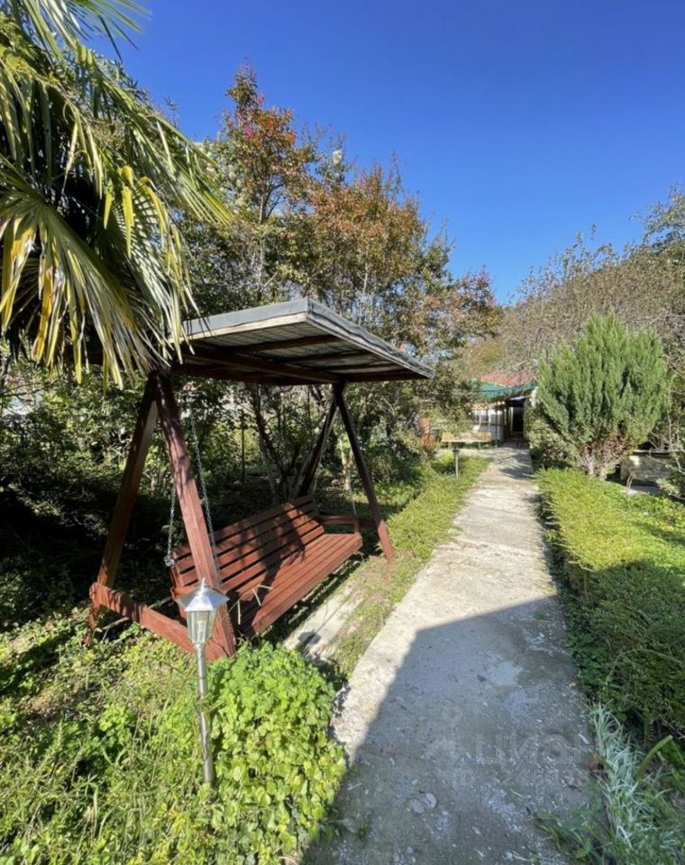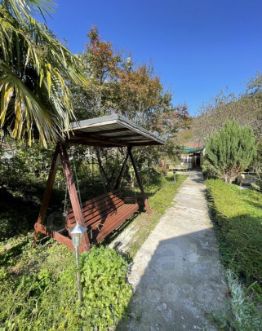 слива, инжир, хурма, яблони, смородина, виноград. По границе проходит ручей — природная свежесть и уют.