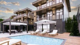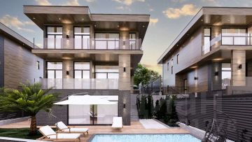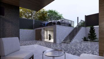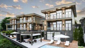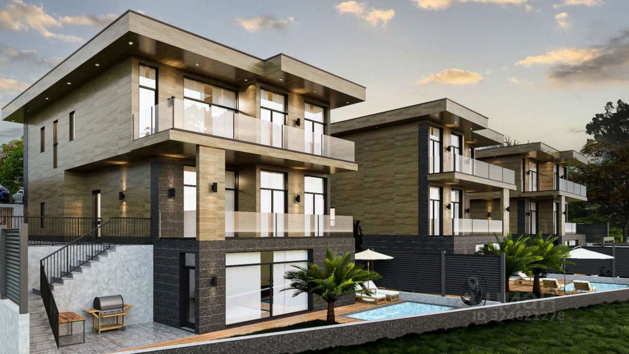 Вилла из трех этажей, монументальное строение. Высокие потолки, фасад из натурального травертина, панорамные окна.