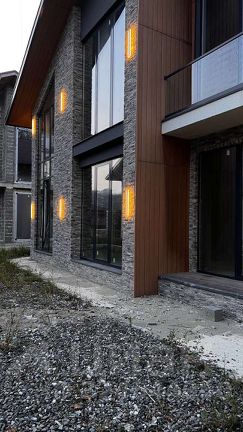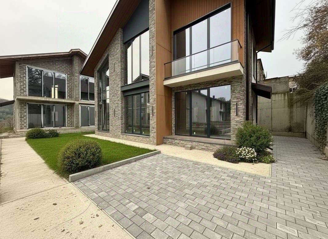 Современный двухэтажный дом в стиле Шале с большими окнами. Фасад в комбинированной отделке (декор-камень + штукатурка), аккуратный участок с видом на зелёный массив.