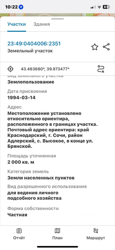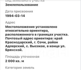 видовой участок 20 сот в селе Высоком. асфальтовая дорога. газ. свет. вода по меже. остановка 137 автобуса прям рядом с участком. на участке фруктовый сад со взрослыми деревьями. всего 43 дерева. инжир. хурма. яблони. черешня фейхуа. всего один сосед справа. до Сириуса и моря 10 минут. до Красной поляны 30. участок на склоне. земля лпх в черте населеных пунктов. получено разрешение на строительство.