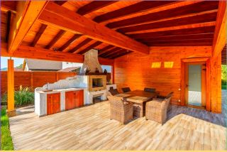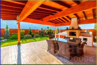 Участок ровный, с зелёным газоном, мощёными дорожками и стильной зоной отдыха под деревянным навесом у бассейна — место, где комфортно проводить лето и тёплые вечера. Большой открытый бассейн курортного формата расположен так, что из дома и беседки открываются эффектные виды на воду и окружающую природу.