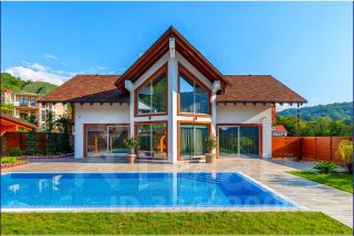 Продаётся современный загородный дом с бассейном за 85 млн рублей — готовый курортный комплекс для жизни и отдыха всей семьёй. Дом сочетает панорамные виды на зелёные холмы, просторную террасу с большим бассейном и ухоженный участок, создавая атмосферу дорогого европейского шале.