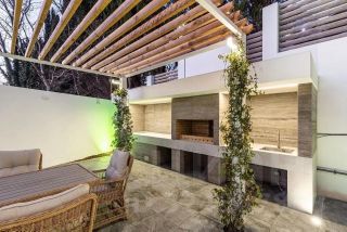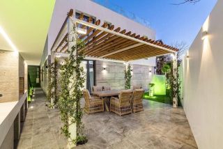 На участке выполнено ландшафтное озеленение. К услугам владельцев - бассейн, джакузи и сауна для релаксации и поддержания здорового образа жизни. Предусмотрена стоянка на три автомобиля.