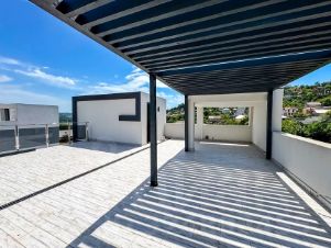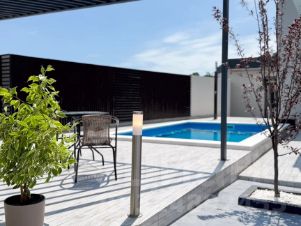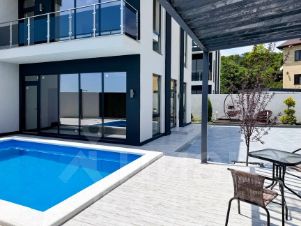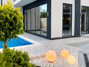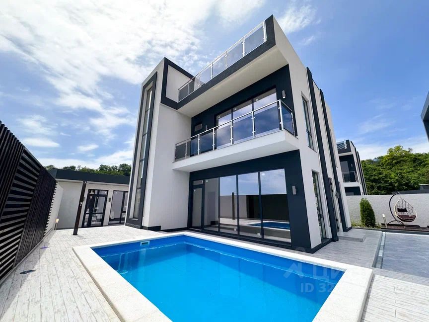 Отличительной особенностью является продуманная до мелочей территория, правильно спланированный ландшафт. У дома свой залитый круглогодично подогреваемый бассейн, зона патио, беседка в стиле дома, высажены круглогодичные растения. Въезд на территорию дома через автоматические ворота. Декоративное освещение,подсветка и ландшафт создают чувство уюта в любое время суток.