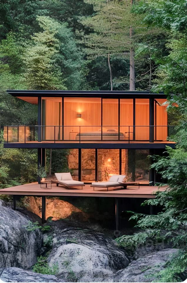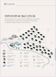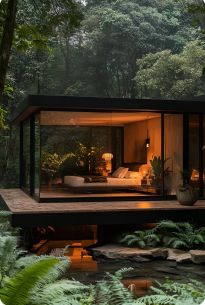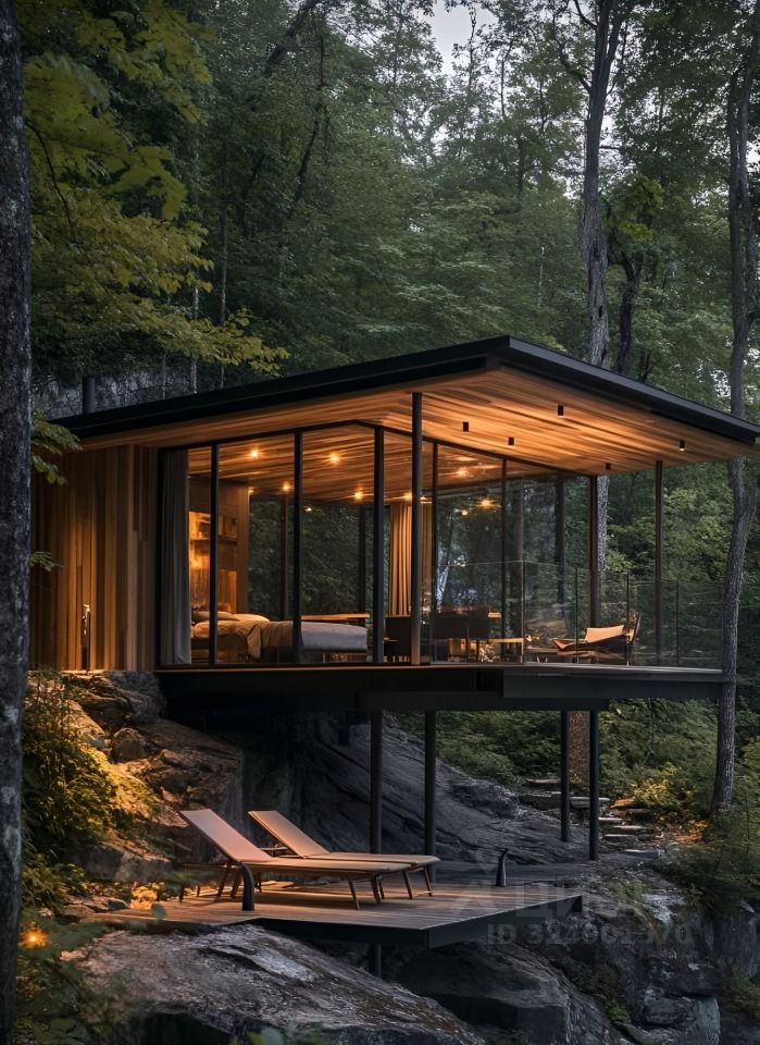На территории площадью 1.36 Га расположены 40 эксклюзивных коттеджей в минималистическом стиле с черным алюминиевым профилем и полностью прозрачными стеклянными стенами, создающими эффект парения среди леса. Инновационная система умного стекла позволяет по нажатию кнопки менять прозрачность на матовый эффект, обеспечивая абсолютную приватность и комфорт.